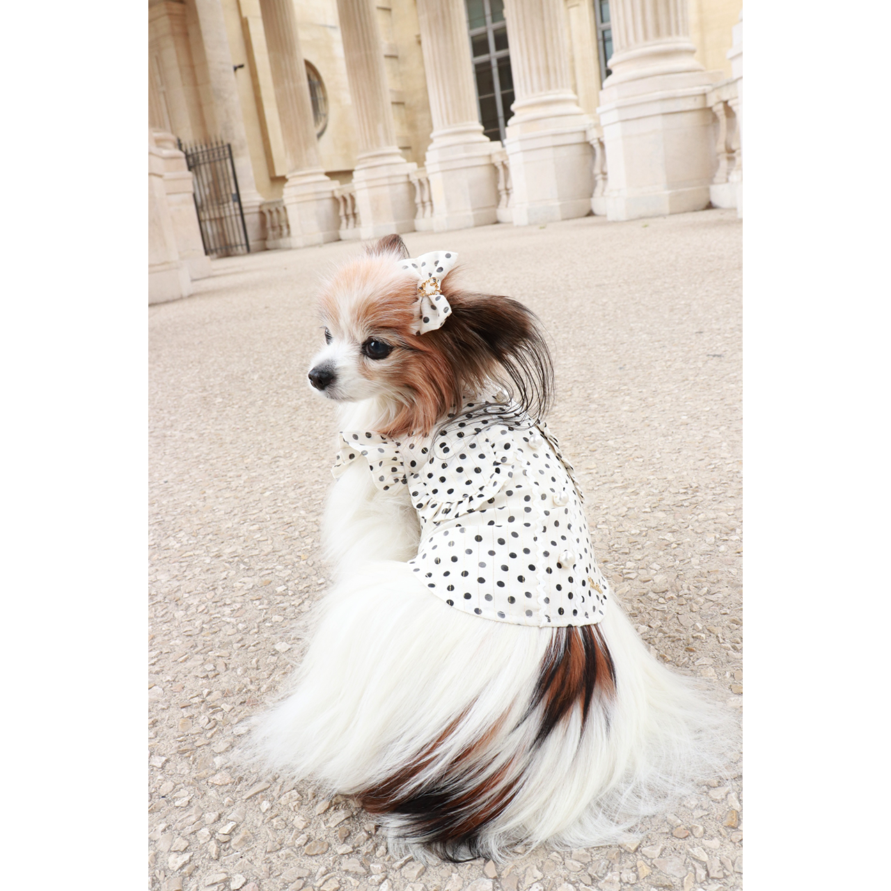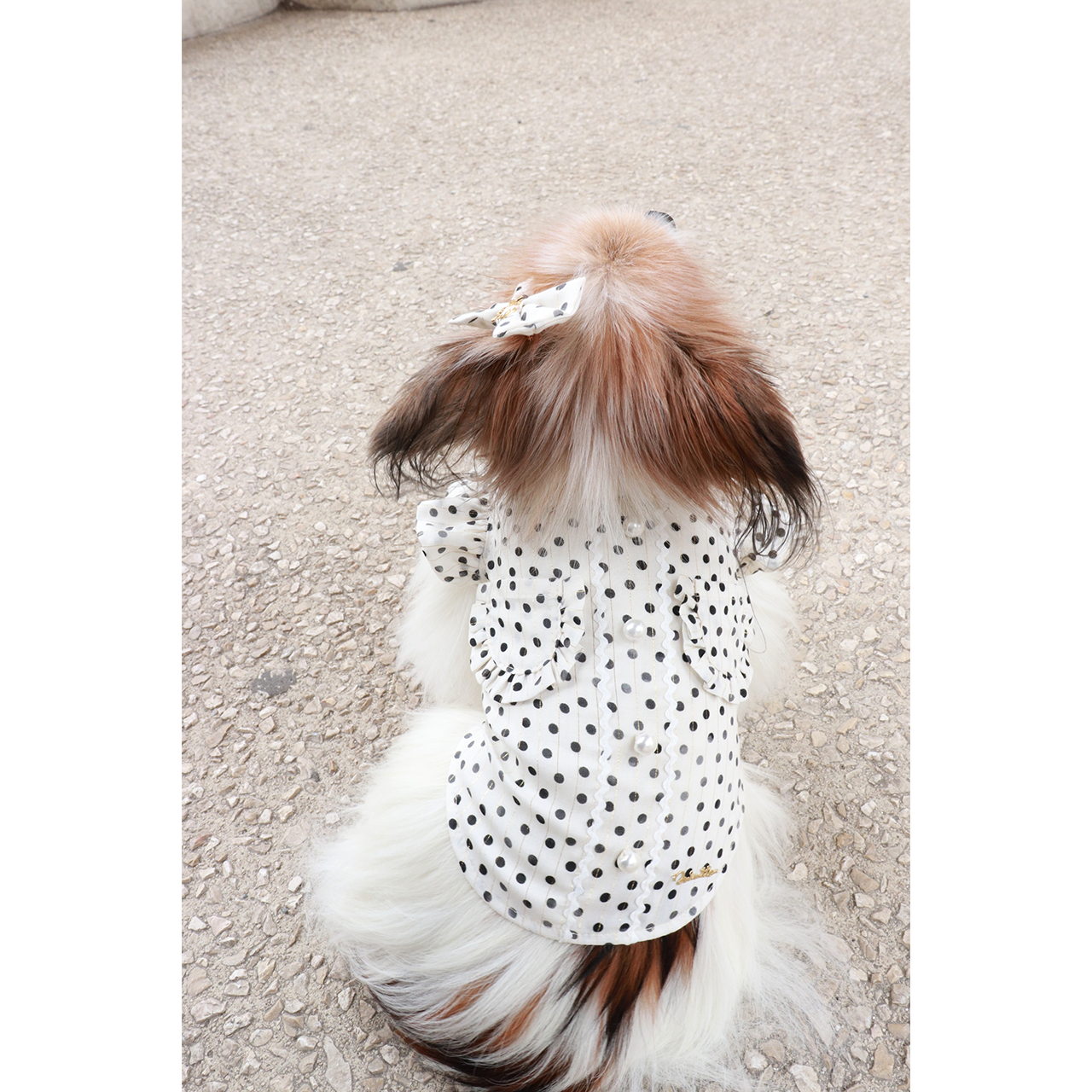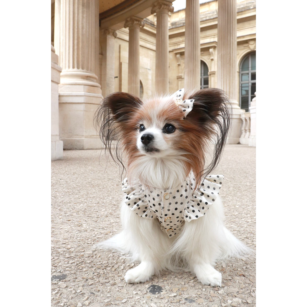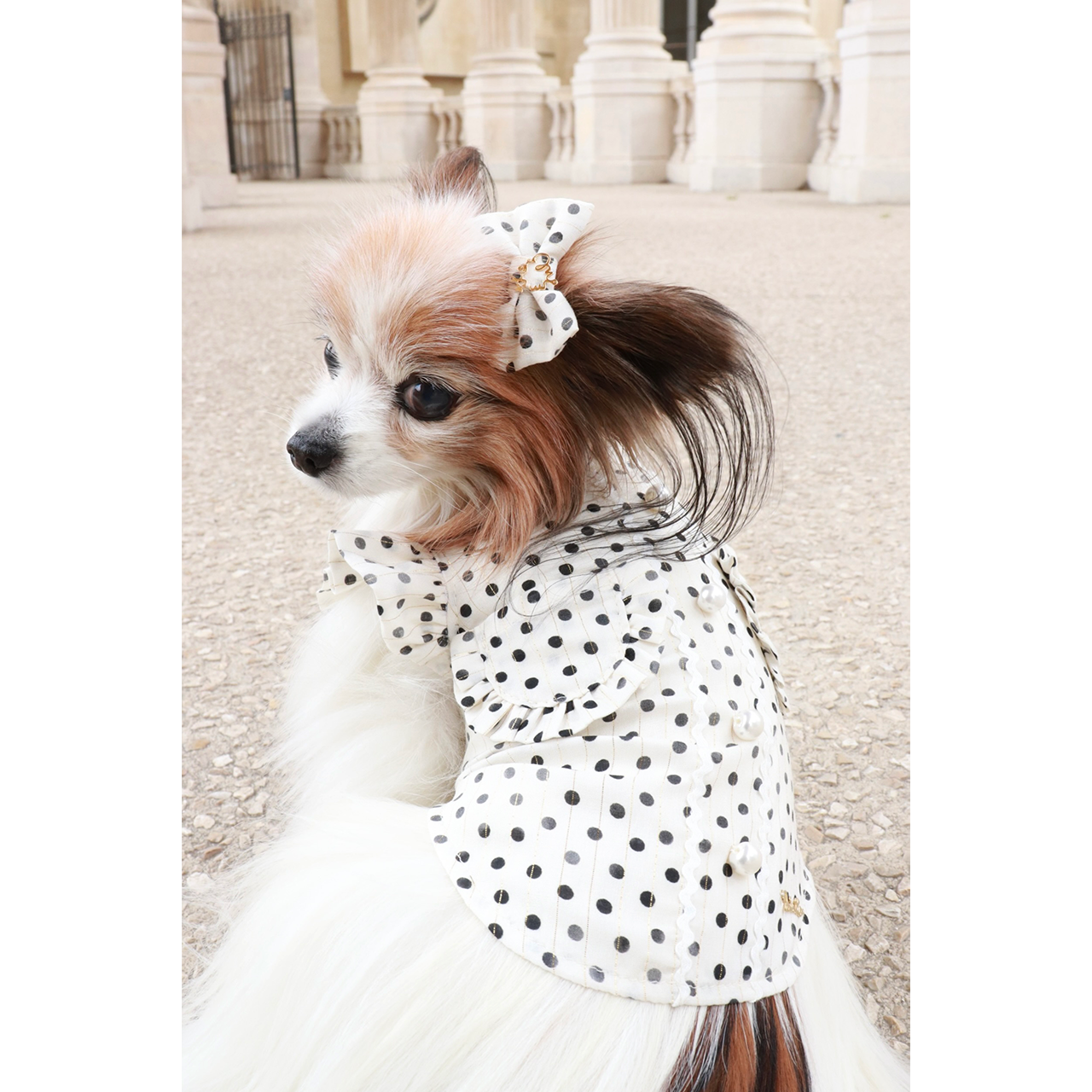 フランス産生地を使用したかすれ風の水玉プリントバレッタ。お揃いのブラウスと合わせることで、統一感のある可愛らしいコーディネートを演出します。